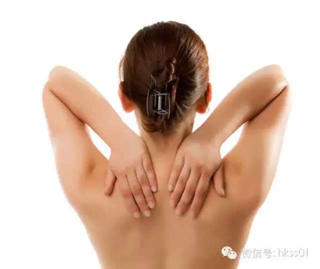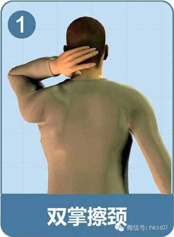 用左手掌來回摩擦頸部,口中默念8下后,開始 捏后頸。然后換右手。有助于頸部放松。