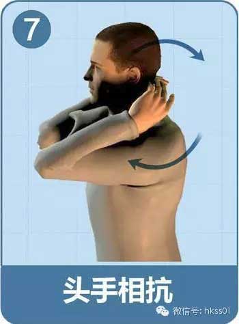 雙手交叉緊貼頸后,用力頂頭頸,頭頸向后用力,互相抵抗5次。