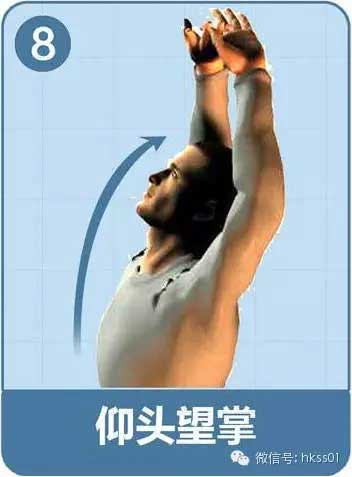 雙手上舉過頭,手指交叉,掌心向上。將頭仰起看向手背。保持5秒。