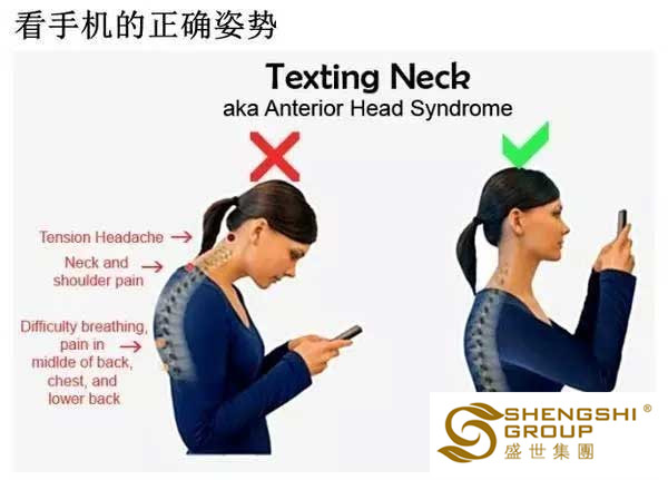 1.看手機時,高抬手持手機,手機屏幕中心與眼睛在同一高度,使頭部保持垂直位。
